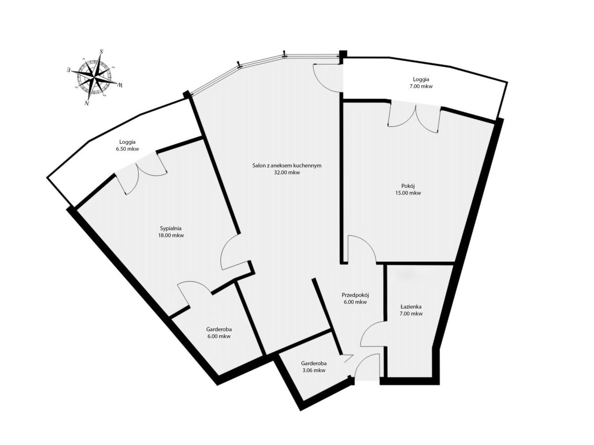 - przestronny salon z aneksem kuchennym (32,00 m²) z wyjściem na większą loggię (7,00 m²),