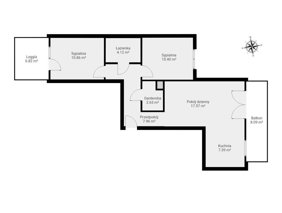- przestronny pokój dzienny (17,57 m²) z wyjściem na balkon (8,09 m²),
